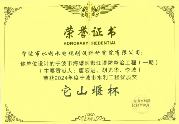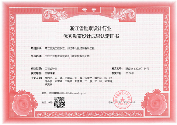 在工程項(xiàng)目方面,獲得2022年度全國(guó)優(yōu)秀工程咨詢成果獎(jiǎng)、2024年度寧波市優(yōu)秀勘察設(shè)計(jì)獎(jiǎng)、2024年浙江省勘察設(shè)計(jì)行業(yè)優(yōu)秀勘察設(shè)計(jì)”綜合類成果獎(jiǎng)、寧波市優(yōu)秀水利工程設(shè)計(jì)二等獎(jiǎng)、“浙江省文明標(biāo)化工地”稱號(hào)、“2024年度寧波軌道交通市域鐵路工程立功競(jìng)賽先進(jìn)集體”等各類獎(jiǎng)項(xiàng)十余項(xiàng)。
