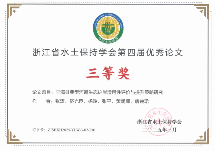 會議現(xiàn)場通報了2024年度生產(chǎn)建設(shè)項目水土保持方案優(yōu)秀單位、2024年度生產(chǎn)建設(shè)項目水土保持監(jiān)測優(yōu)秀單位,并為獲獎集體進(jìn)行表彰。隨后,又現(xiàn)場表彰了浙江省水土保持學(xué)會第四屆優(yōu)秀論文評選結(jié)果。我院榮獲2024年度生產(chǎn)建設(shè)項目水土保持方案優(yōu)秀單位、2024年度生產(chǎn)建設(shè)項目水土保持監(jiān)測優(yōu)秀單位兩項集體榮譽(yù),并且以論文《寧??h典型河道生態(tài)護(hù)岸適用性評價與提升策略研究》獲得浙江省水土保持學(xué)會第四屆優(yōu)秀論文三等獎。