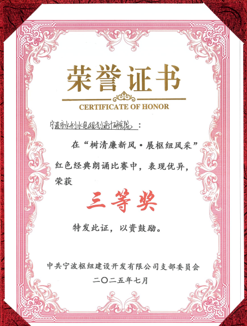 為慶祝中國共產(chǎn)黨成立104周年,2025年7月1日,寧波樞紐建設(shè)開發(fā)有限公司隆重舉行了“紅動(dòng)樞紐·同心共建”迎“七一”主題黨建活動(dòng)。作為寧波樞紐片區(qū)重要參建單位和黨建聯(lián)盟成員,我院黨總支書記、副院長王洪霞帶隊(duì)參與了本次活動(dòng),并且,我院兩位青年職工攜選送作品在“樹清廉新風(fēng)·展樞紐風(fēng)采”樞紐片區(qū)紅色經(jīng)典朗誦比賽中榮獲三等獎(jiǎng)。