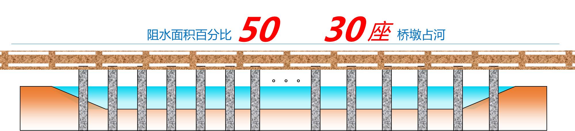 根據(jù)原設計,共有30座橋墩占用河道, 20年一遇設計水位條件下,橋墩阻水面積百分比達到50%以上,不符合《浙江省涉河橋梁水利技術規(guī)定》關于“跨越III級及以下堤防以及無堤防河道的橋梁的阻水面積百分比不宜大于6%,不得超過8%。”的要求