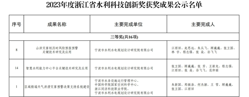 近日,浙江省水利廳公布2023年度浙江省水利科技創(chuàng)新獎獲獎名單,寧波市水利院申報(bào)的3項(xiàng)成果順利通過公示,榮獲浙江省水利科技創(chuàng)新獎三等獎