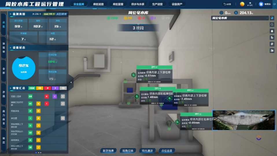 水庫大壩是流域防洪工程體系重要組成部分,是保障水安全的“重器”。數字孿生周公宅-皎口梯級水庫系統(tǒng)利用高精度模擬仿真引擎1:1構建水庫大壩可視化模型和工程安全監(jiān)測分析模型,全面監(jiān)控、深入分析水庫環(huán)境量、變形、滲流、應力應變、地震等安全要素,逐時分析大壩的各項安全指標,直觀展示大壩的安全狀態(tài)。