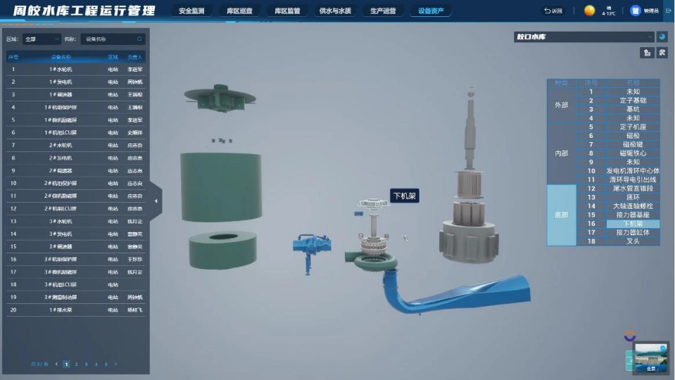 依托BIM仿真建模技術,數字孿生周公宅-皎口梯級水庫系統(tǒng)實現了對水庫重要設備資產的精細管理。結合監(jiān)測監(jiān)控數據,實時掌握水庫防洪、供水、發(fā)電的運行狀況,保障水庫安全高效運行。同時,利用BIM技術對水輪機、發(fā)電機等重要機電設備進行零部件級的拆解,“再現”設備的內部機構和狀態(tài)。這一技術幫助水庫工作人員直觀、深入地了解設備的運行原理與機制,為設備的精細管理及維修養(yǎng)護提供重要支持,也大幅提升了水庫設備管理的智能化水平。