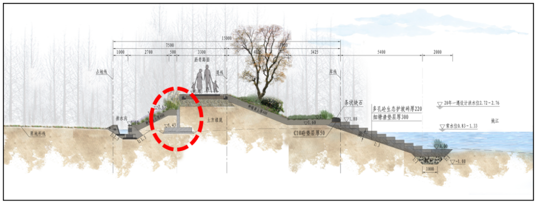 為了保證水體交換同時防御土體掏刷,工程迎水側護坡采用多孔混凝土生態(tài)護坡磚,不僅防沖固土,也利于水生動植物生長,營造自然、生態(tài)的水岸環(huán)境。
